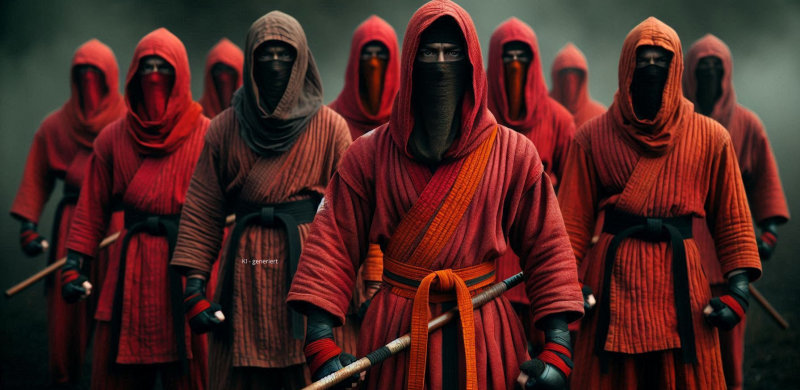 »So, so und was?« Herdan machte große Augen. Weiter kam er aber nicht, denn hinter Lilian tauchten drei Gestalten auf. Ihre Körper waren in rote Leinengewänder gehüllt, um die Hüften gehalten von orangefarbenen oder schwarzen Stoffgürteln. Die Gesichter waren – bis auf die Augen – mit Gesichtstuch und Stirnband bis zur Unkenntlichkeit vermummt. Sie wirkten wie Kämpfer aus einem fernen Land.