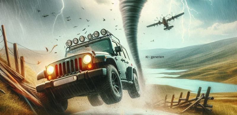 Das Fahrzeug begann sich zu drehen und rutschte der abfallenden Böschung entgegen. Ein Ruck und der Jeep hob ab, wurde leicht wie eine Feder vom Sog emporgetragen und verschwand in dem alles verschlingenden Wirbel. Dann trat Stille ein.